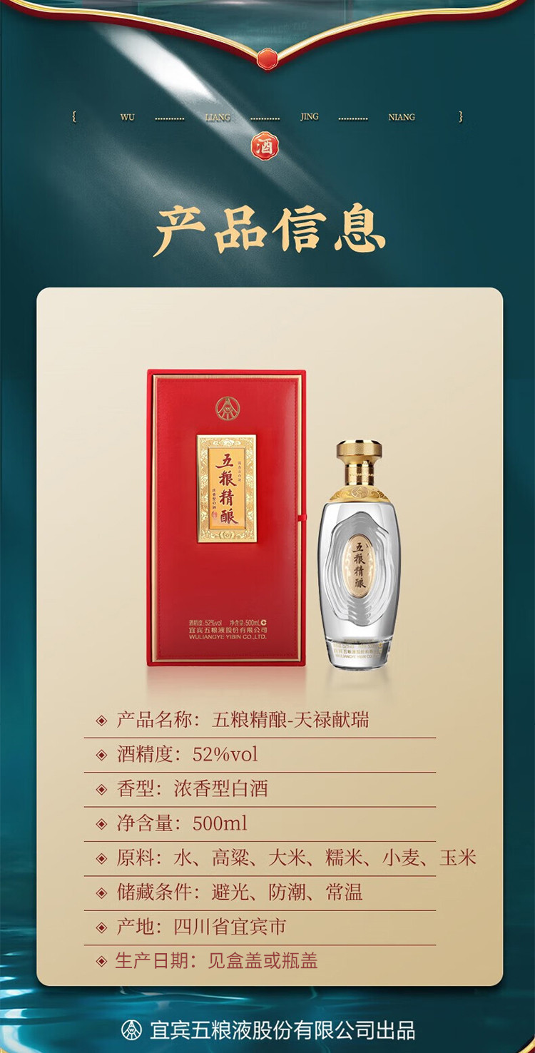 股份 五粮精酿天禄献瑞52度500ml*2瓶固态法浓香型白酒