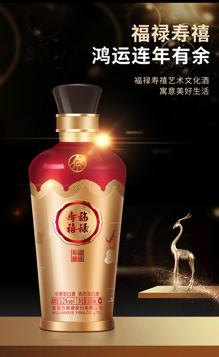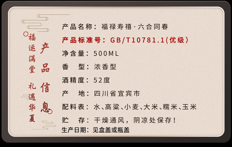 股份福禄寿禧 六合同春 浓香型白酒 52度 500ml*6瓶