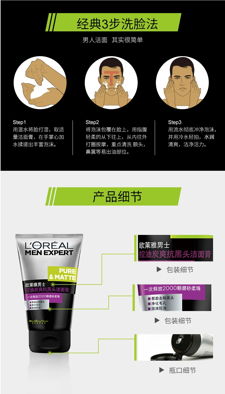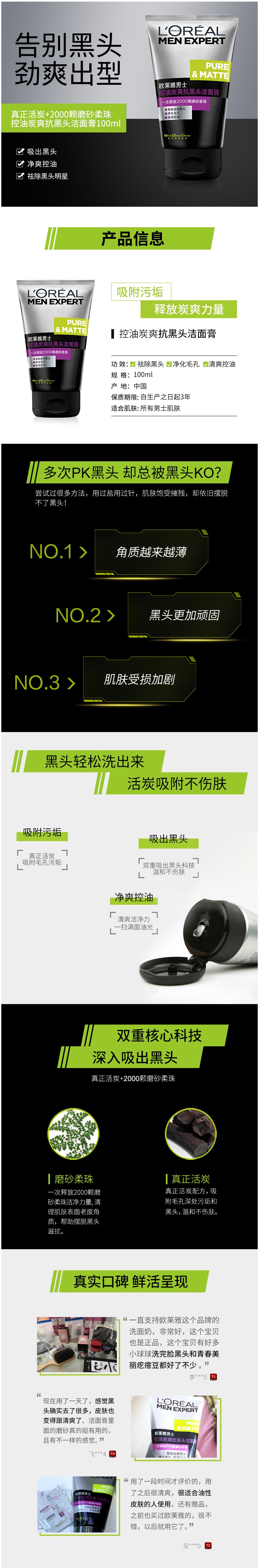 欧莱雅 男士控油炭爽抗黑头洁面膏