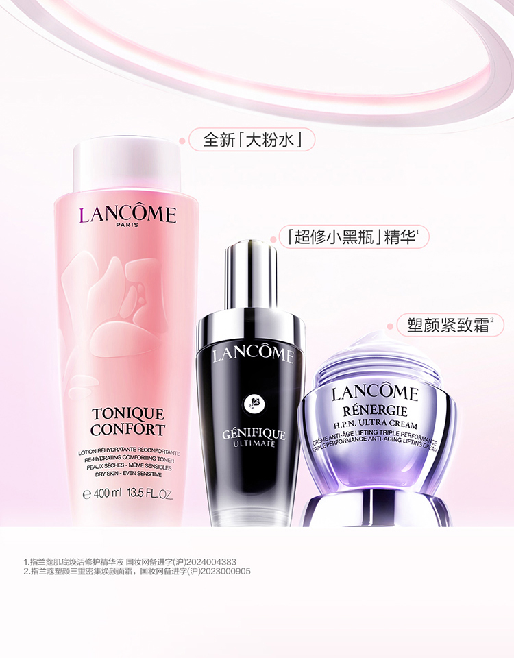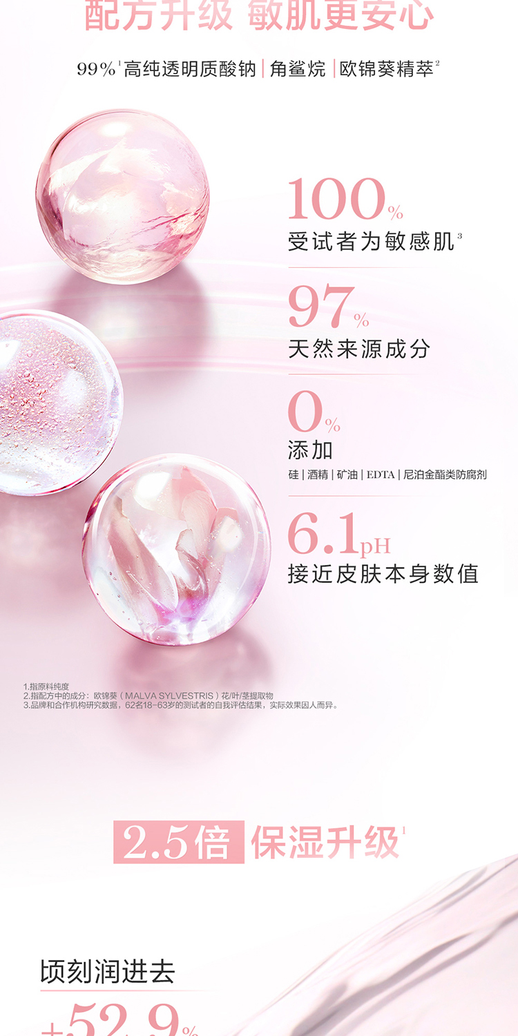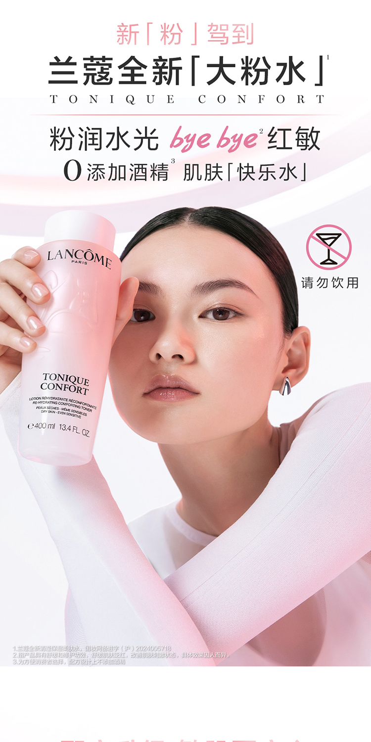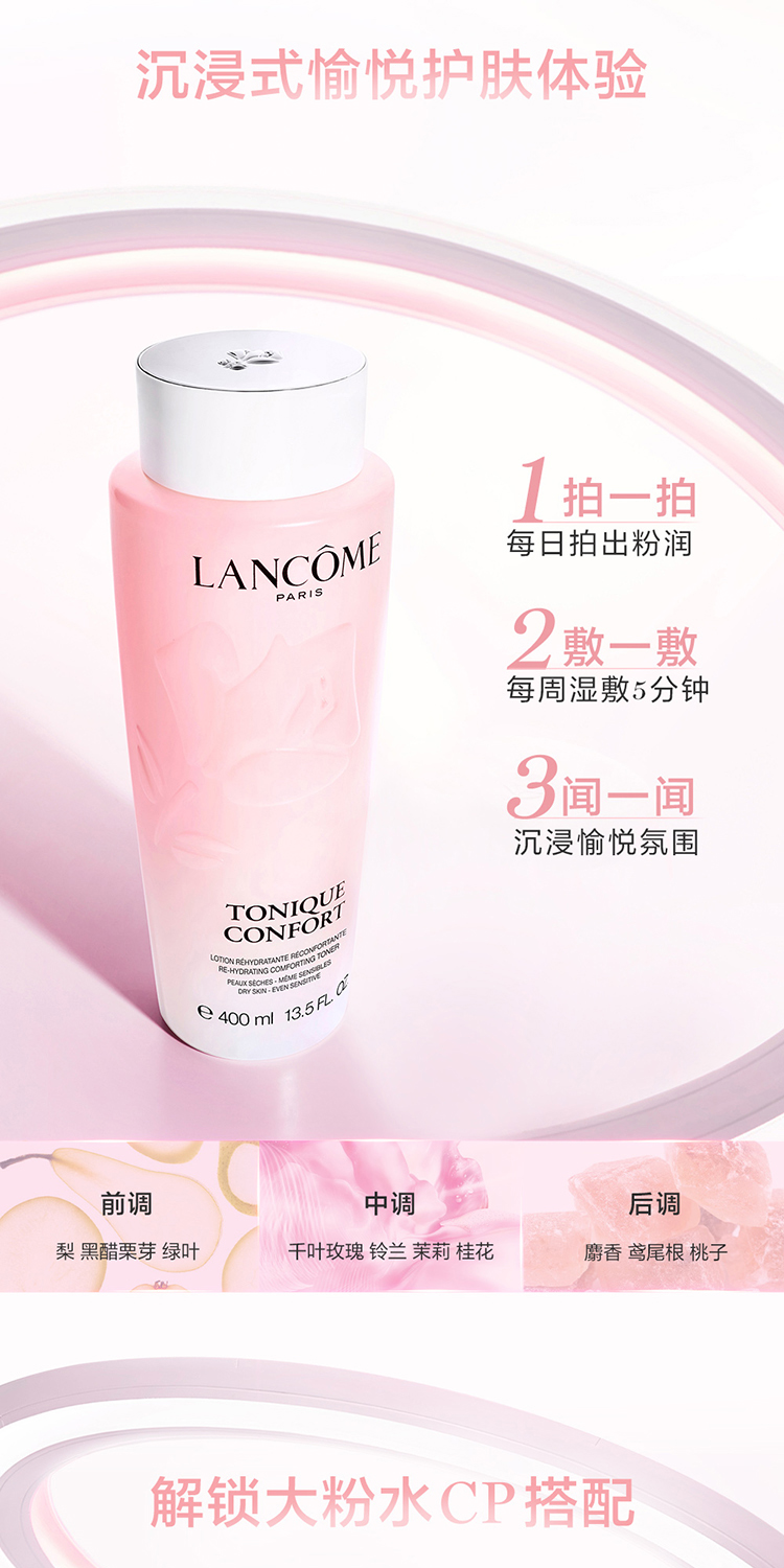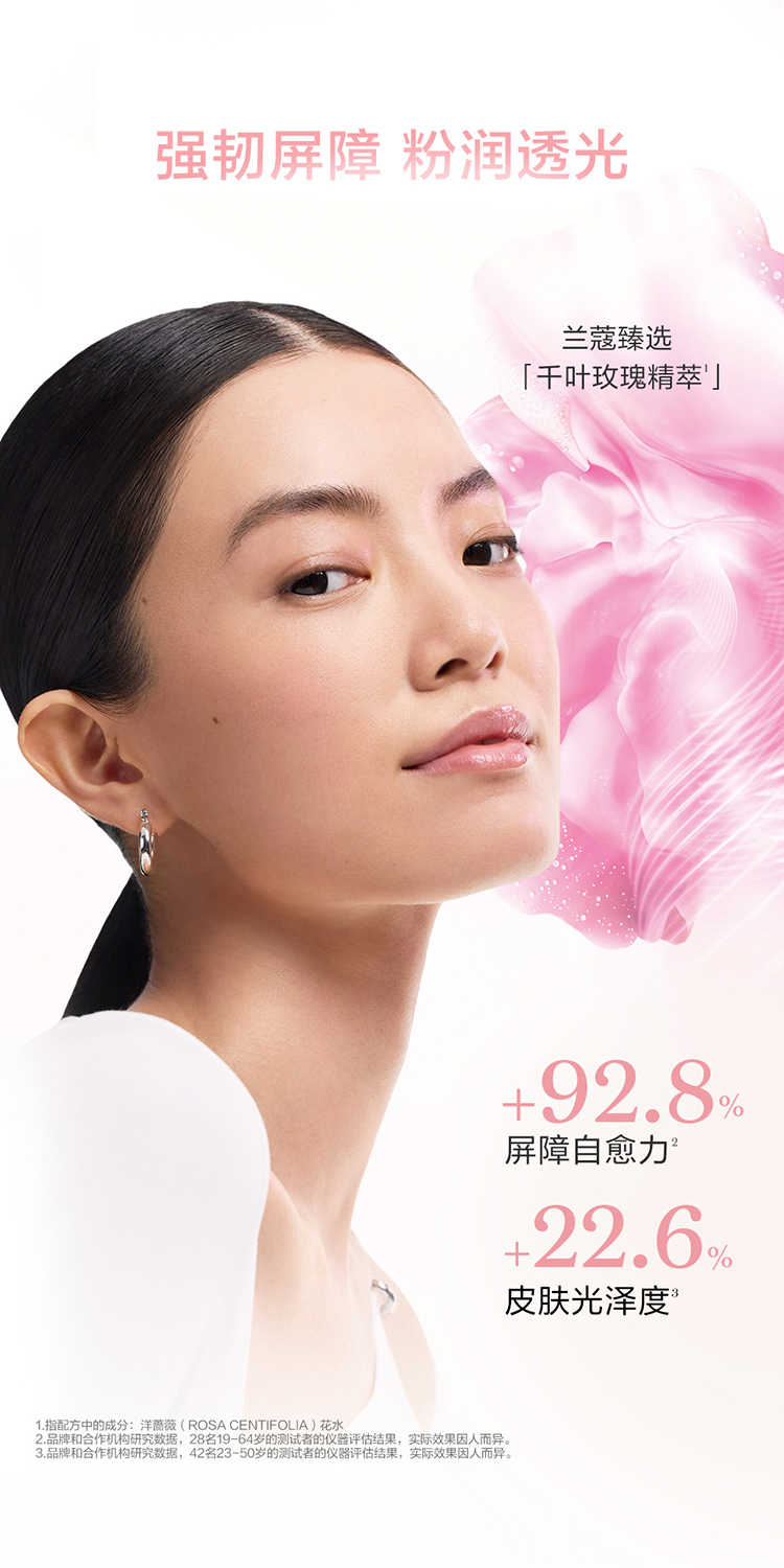 全新兰蔻清滢柔肤水如今添加高纯千叶玫瑰水,并辅以生物科技活性成分[透明质酸纳和角鲨烷]。