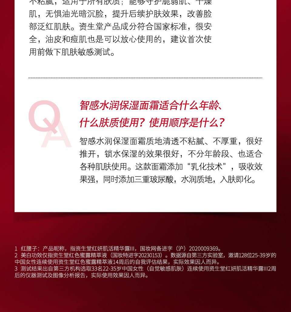 4.使用化妆品过程中出现红斑,红肿,痒,刺激等异常情况,请立即停止使用该产品并向皮肤科医生进行相关咨询。