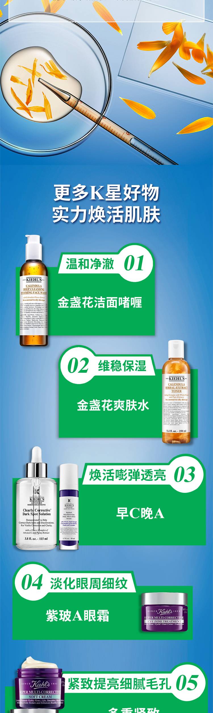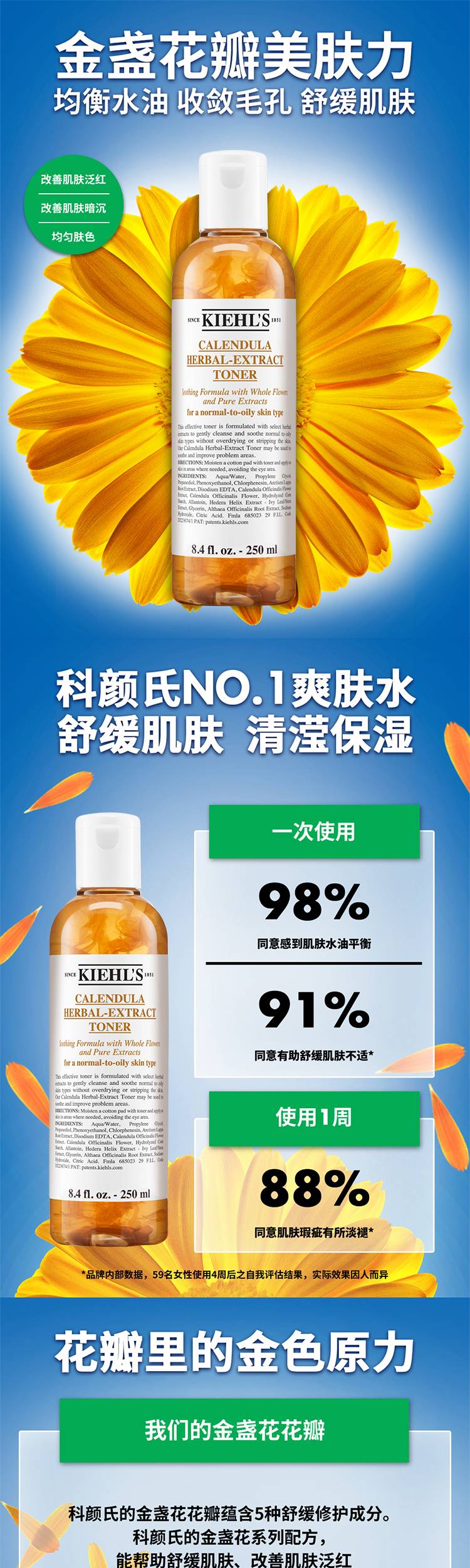 科颜氏金盏花植物爽肤水因其清新温和的功效而成为20世纪60年代的永恒经典。在这款不含酒精的科颜氏金盏花植物活肤水中,添加了天然金盏花成分,能温和清洁和舒缓中偏油性肌肤、均衡调理肌肤的油脂,适合各种肤质使用,尤其是油性肌肤与有青春痘困扰的混合性肌肤。时至今日,科颜氏金盏花植物爽肤水仍收到无数顾客的钟情。