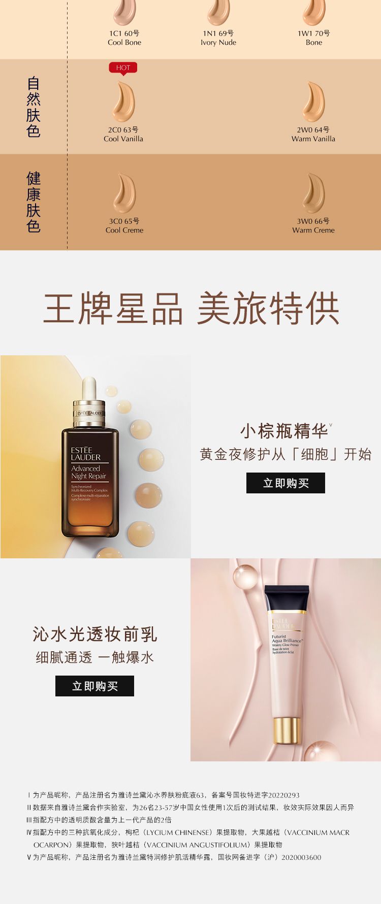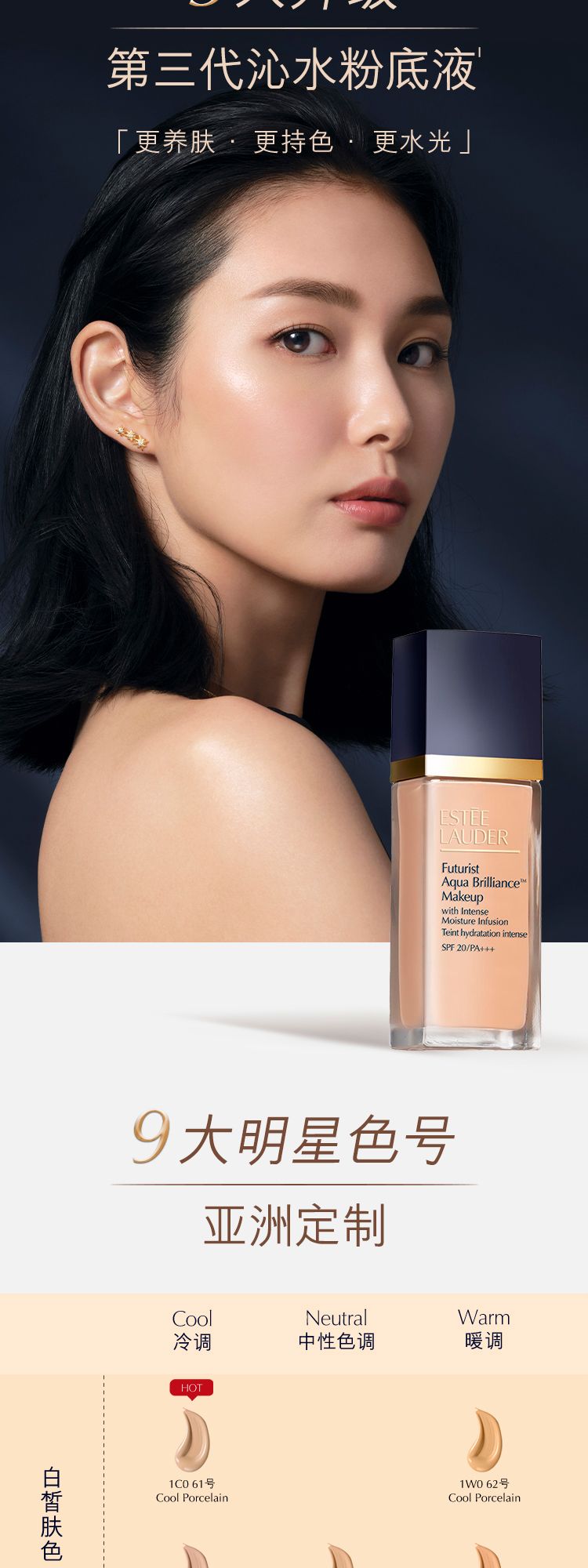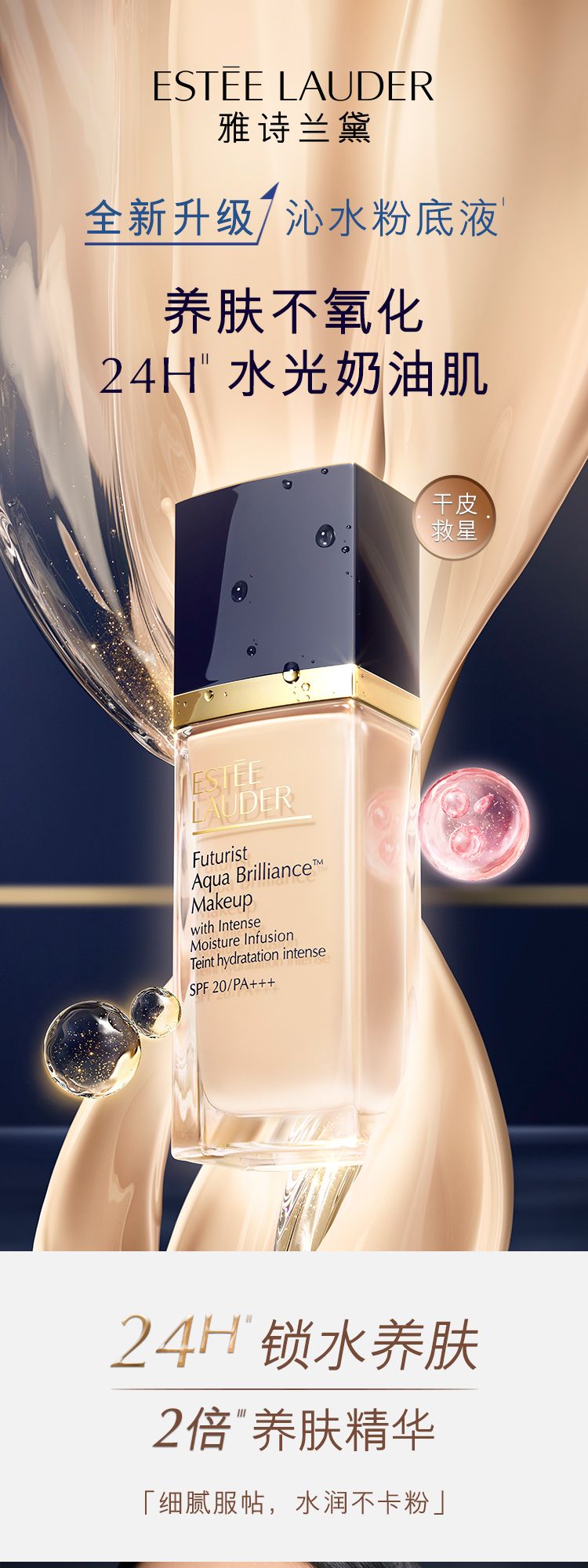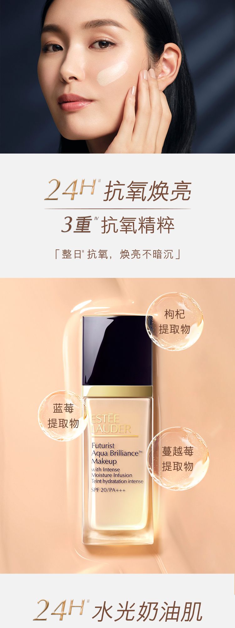 一抹焕亮天然美肌。雅诗兰黛沁水养肤粉底液,以83%养肤成分和独家Super-Berry Ferment™,打造令人难以置信的无瑕水光奶油肌。内含两种透明质酸,高效水润,让肌肤即刻充盈润泽。持续使用一段时间,有效改善肌肤水润度和光泽度。